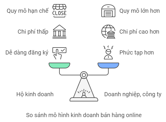 Khi kinh doanh theo mô hình bán hàng online, chúng ta có thể đăng ký hộ kinh doanh hoặc thành lập doanh nghiệp, công ty. Ở mỗi loại hình sẽ có những ưu và nhược điểm khác nhau, bạn đọc có thể cân nhắc để lựa chọn mô hình kinh doanh bán hàng online phù hợp.